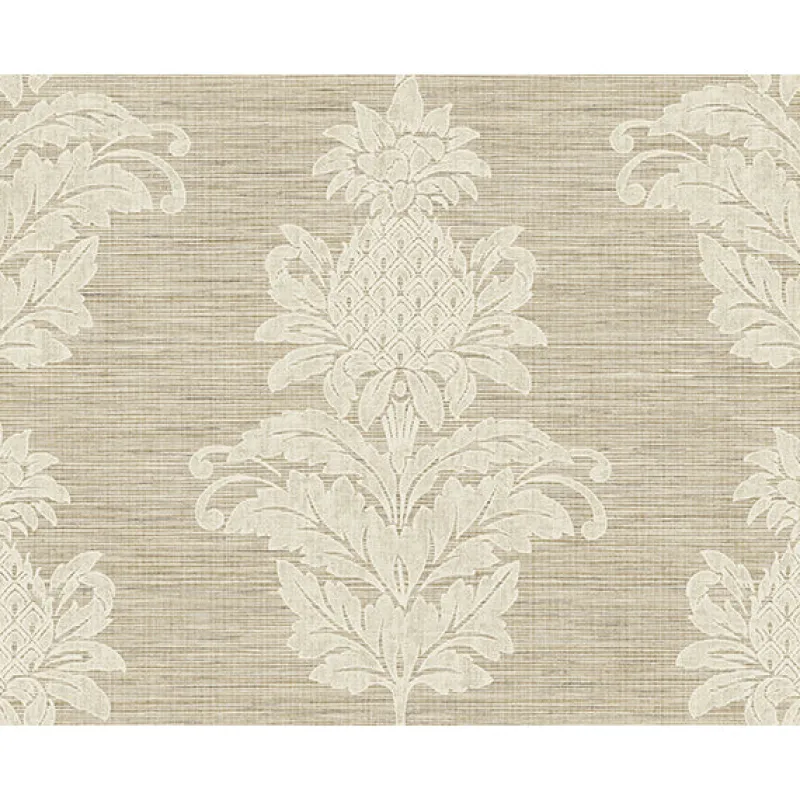 Creamy brushed floral damasks stamp on tan striped faux grasscloth in this fancy take on a classic neutral wallpaper.