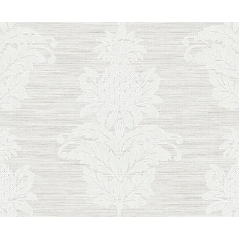 Creamy white brushed floral damasks stamp on light grey striped faux grasscloth in this fancy take on a classic neutral wallpaper.