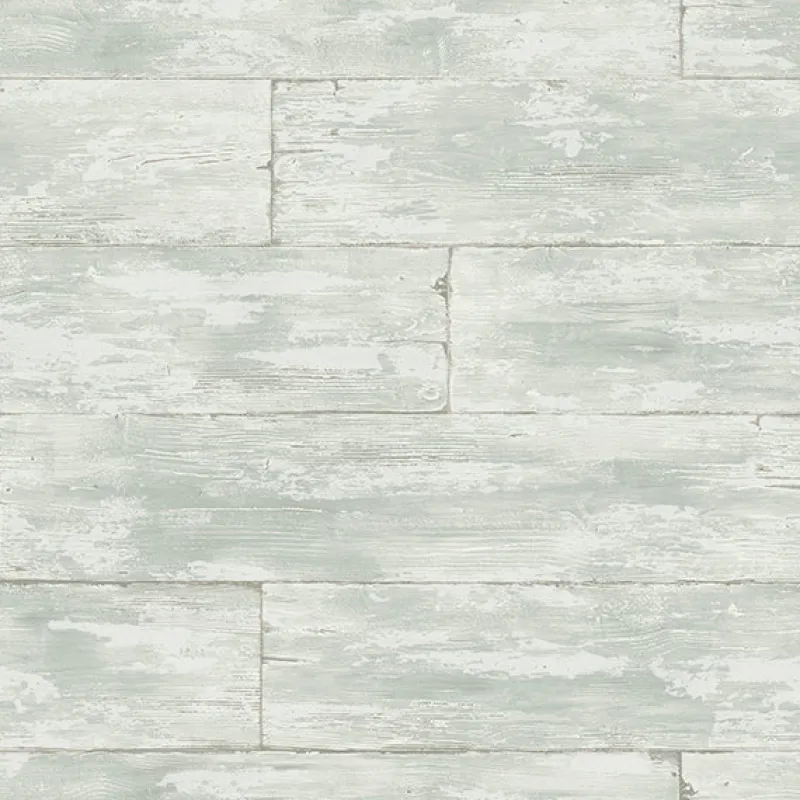 Faded and aged light grey wood planks stack and tile in this faux natural wallpaper that creates a rustic feeling in your home.