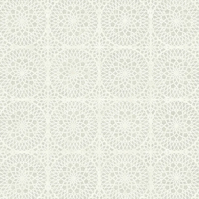 Creamy white iron-looking medallions tile together in this light grey wallpaper to create geometric symmetry.