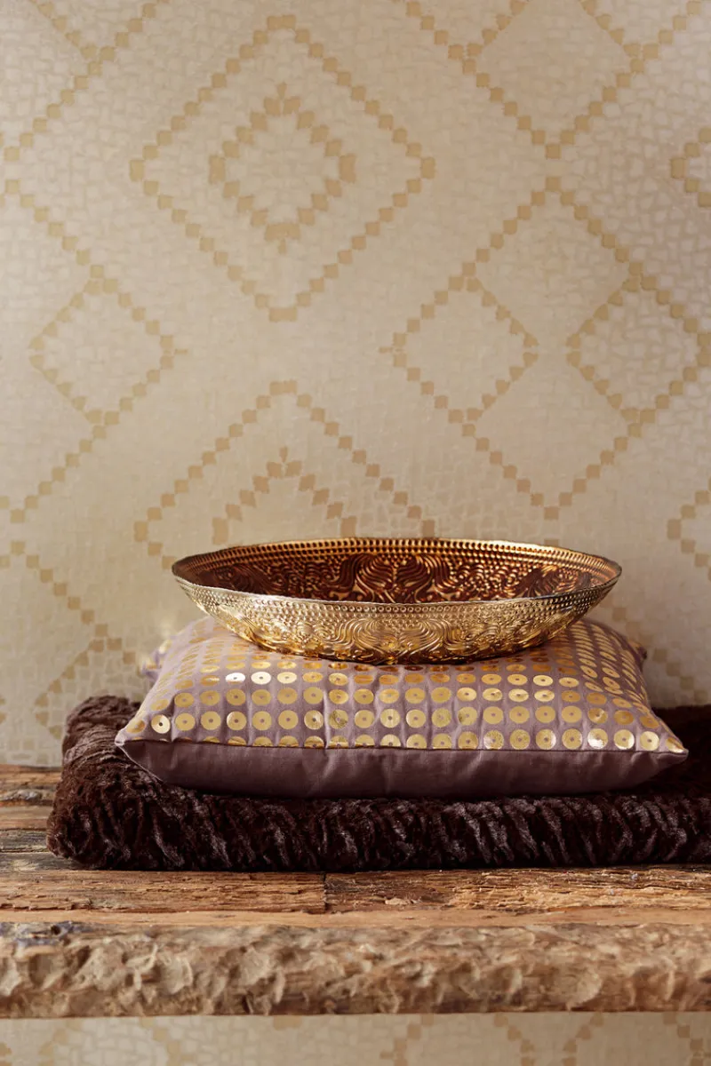 This contemporary kilim wallpaper design was inspired by the gorgeous rugs of Persia, with a myriad of diamonds forming a snake-like geometric. Laden in an abundance of glass beads on a polished brass and gold Aztec shimmer.