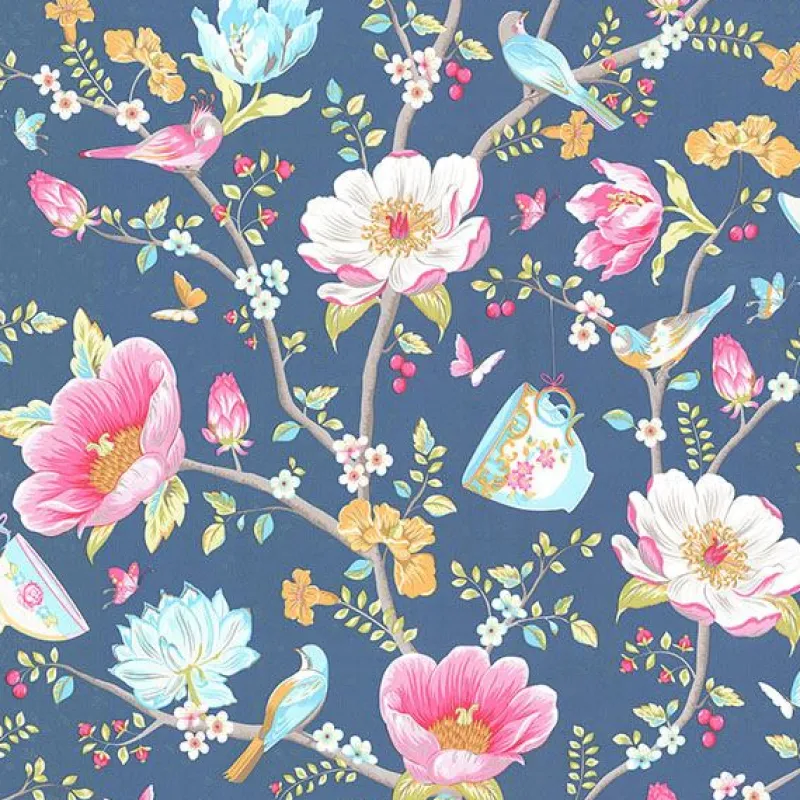 Get lost in this enchanted garden filled with flowering branches, birds and teacups. Set against a chic blue canvas, pastel accents add a happy and colorful finish to your home.