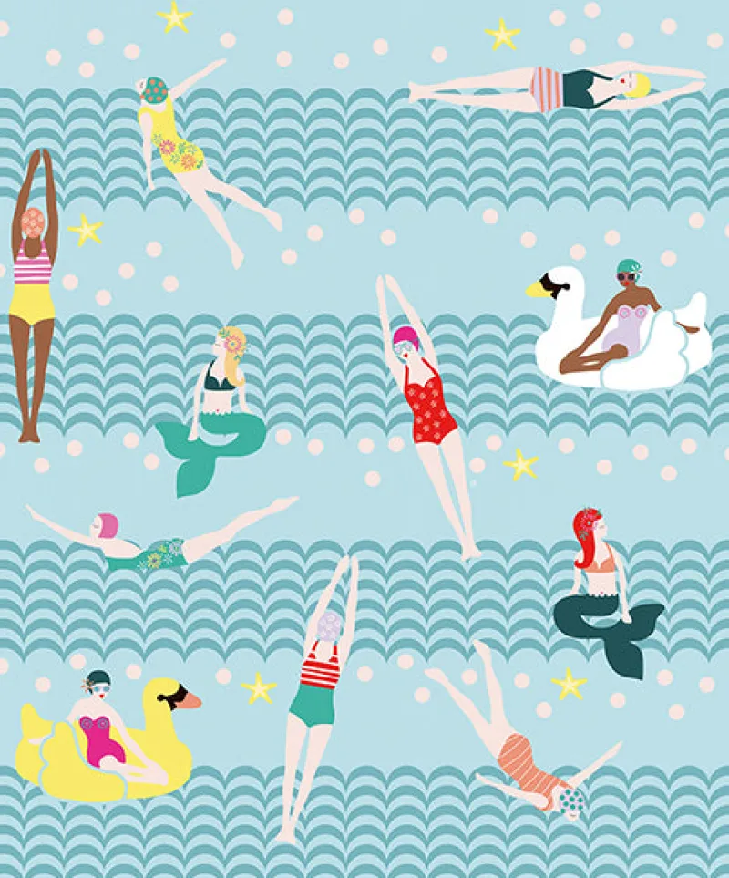 Mermaids, retro swimmers, and swan floats are the stars of this bright and bubbly mural. Scalloped stripes make up waves that stretch across the 5 panels. Mural measures 9 feet 2 inches tall x 7 feet 6 inches wide when assembled.