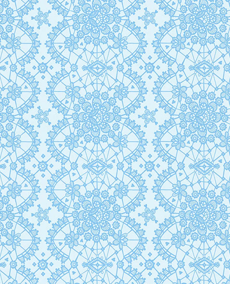 This raised ink wallpaper has a whimsical feel to it. A folksy lace pattern in cyan cascades across a pearlescent ice blue.