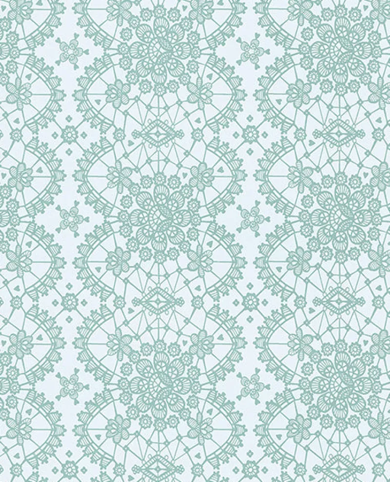 Hidden hearts and flowers are artfully woven into a delicate lace pattern. The raised mint ink pops against a pearlescent pale green background.
