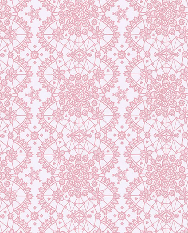 This pearlescent pale pink wallpaper features a delicate lace pattern. The raised lace design is printed in a charming bubblegum pink.