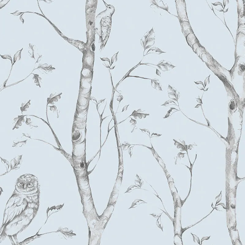 Like a cool winter night, this pale blue wallpaper is quiet and calm. Snowy owls keep watch perched on their branches overlooking the forest. This peel and stick wallpaper is specifically designed to apply and remove with ease, and without damaging your walls. Comes on a 20.5 in x 18 ft roll.