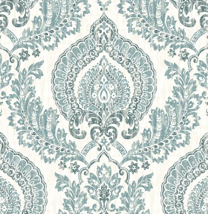 This beautifully designed damask peel and stick wallpaper has a warm grey texture effect that complements the vintage teal and midnight green pattern. The peel and stick material allows you to redecorate in minutes, and change out the design in seconds.