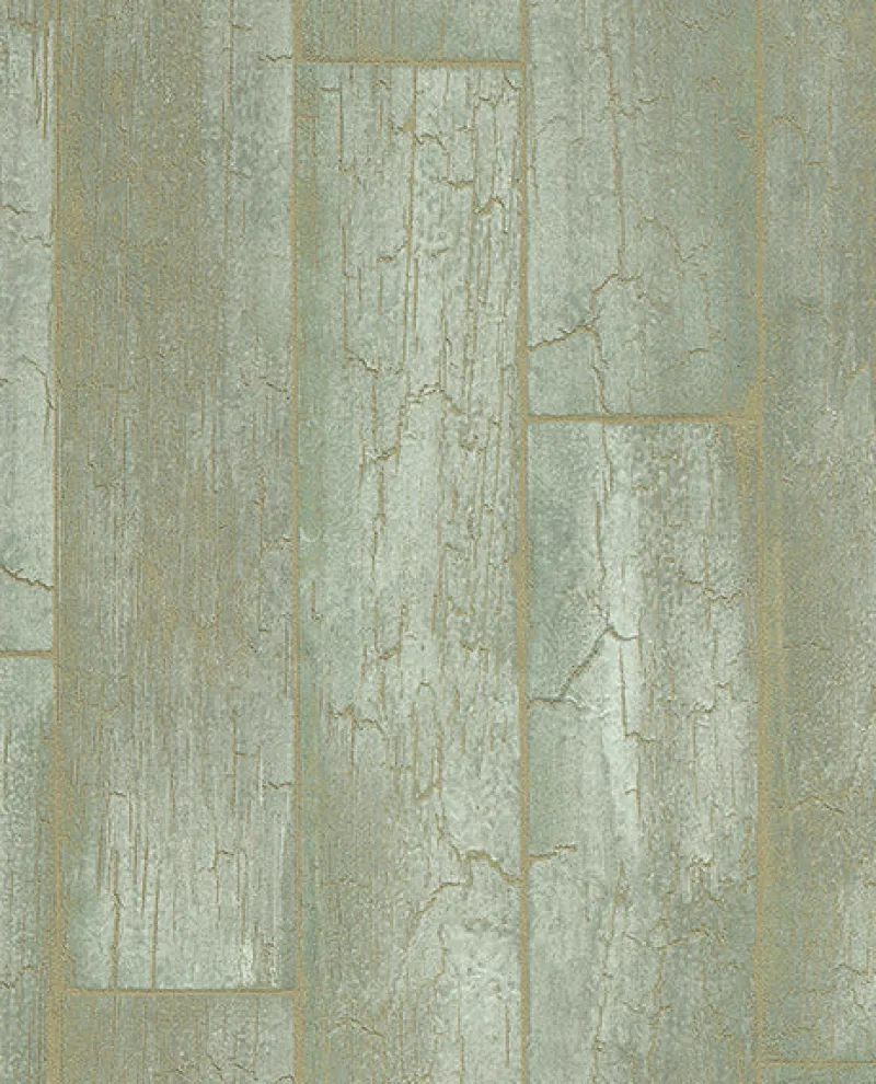 A unique wood wallpaper. This design almost takes on another life. The sea green background is accented by a gold crackle effect that has a metallic finish. Planks measure four inches.