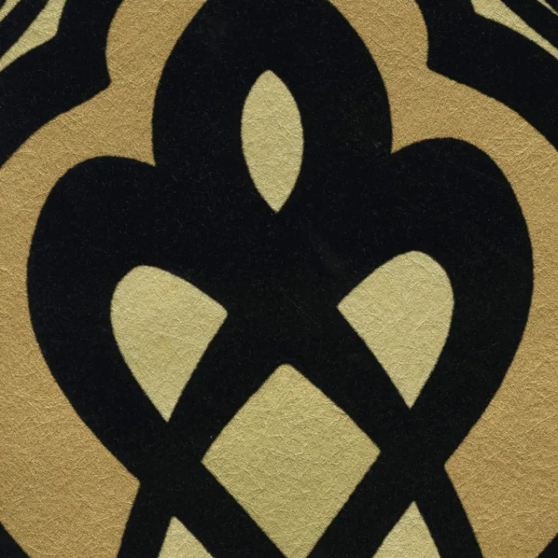 A seductive swirling damask is realized in various layers of shimmering splendor. This large scale design has elegant curves and a contemporary, silhouette style simplicity. Lavish black velvet flock over a burnished gold texture effect.