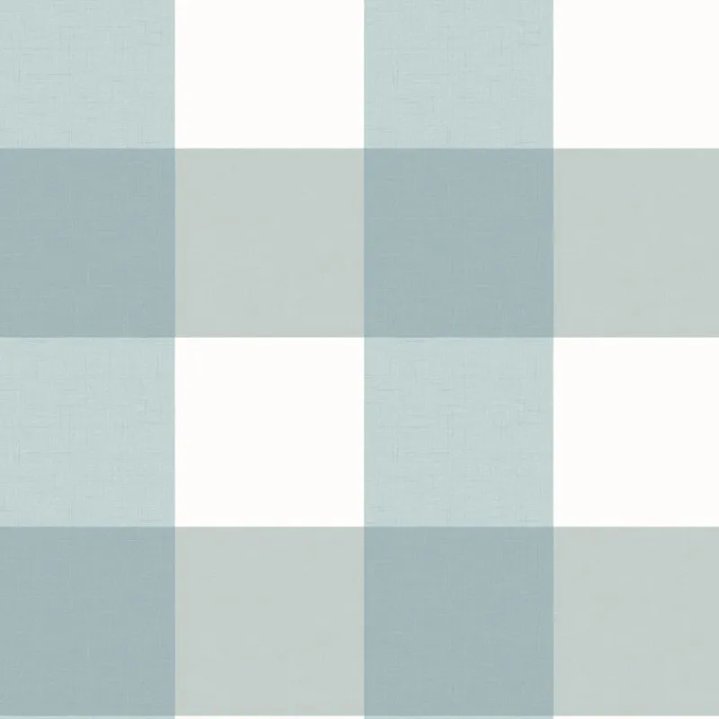 Made to resemble fabric, this gingham wallpaper has subtly distressed details. Its pleasing teal, grey and white large scale pattern gives it a fresh feel. Selah is a prepasted, coated heavyweight paper wallpaper.