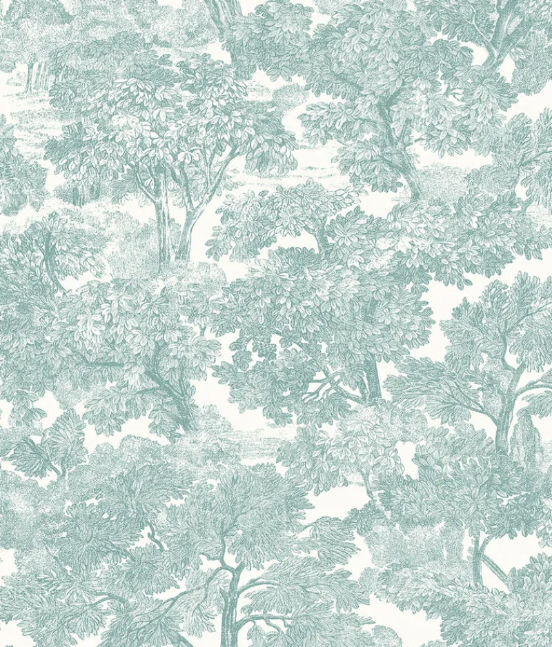 With the subtle look of linen, this toile wallpaper has a hand drawn design. Its lovely teal pattern pops against a white background, creating a charming vintage wallpaper. Spinney is a prepasted, coated heavyweight paper wallpaper.