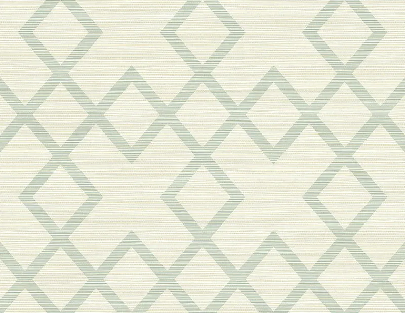 A seafoam diamond print pops against a cream background in this grasscloth inspired wallpaper. Its woven design and soft gold details add to its realistic look. Vana is an unpasted, vinyl wallpaper.