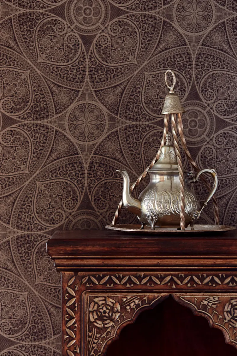 Espresso brown, stamped with a glorious mica shimmer. This ornate Arabesque wallpaper is swirled with tree of life branches and an intricate design evocative of a henna tattoo.