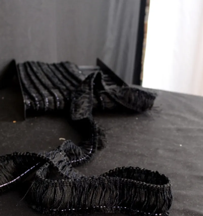 Black brush fringe trim. FM500 31 from Classical elements is a beautiful full black brush trim with some chenille threads. Perfect for framing throw pillows or adding to cushions.