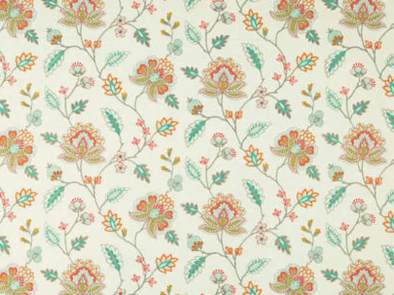 Orange Teal Embroidered Floral Augusta Persimmon Covington Fabric