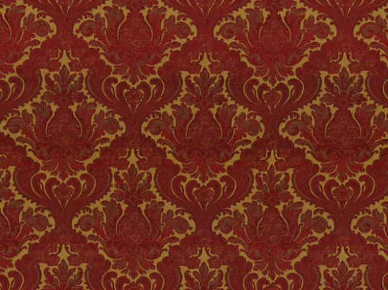 Balenciaga Moroccan Red is a bright golden tan and deep red soft chenille large damask patterned upholstery fabric from Covington.