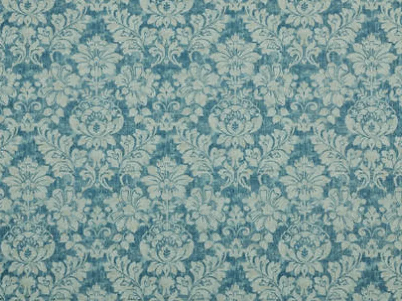 Bizou Denim Blue Damask Floral Print On Basketweave Cotton Covington Fabric