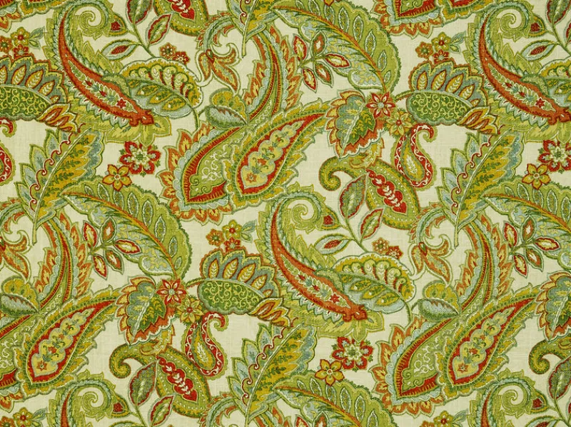 Camden Multi is a pretty bright green multicolored floral paisley print fabric from Covington.