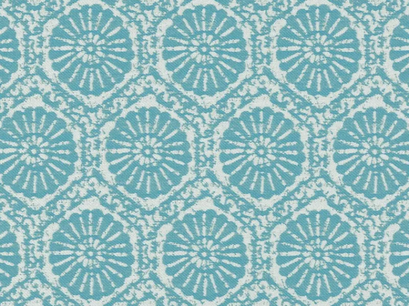 Fossil Spa is a pretty light turquoise blue geometric medallion patterned outdoor fabric from Covington.