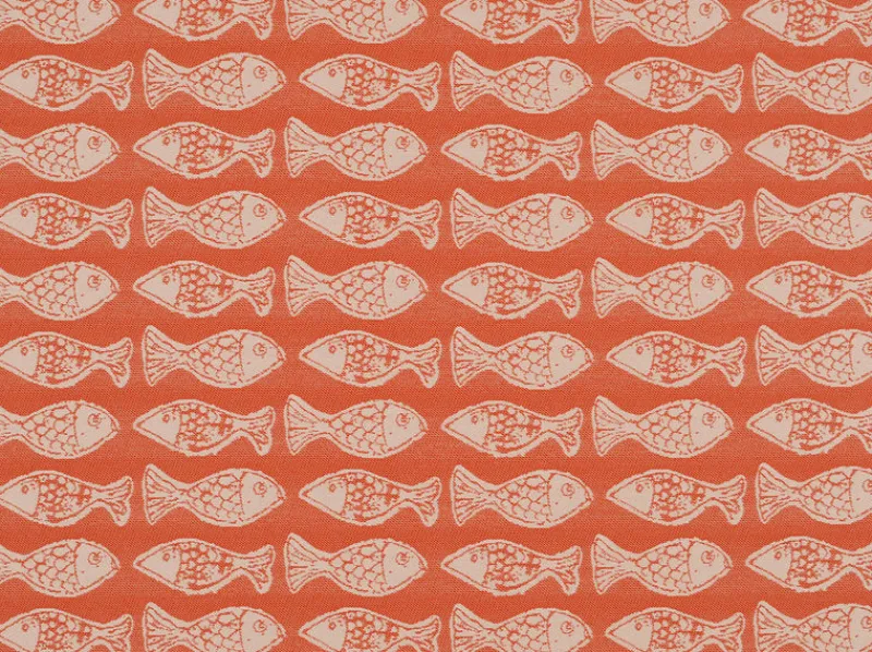 School Of Fish Persimmon is a bold bright red fish print outdoor fabric from Covington.