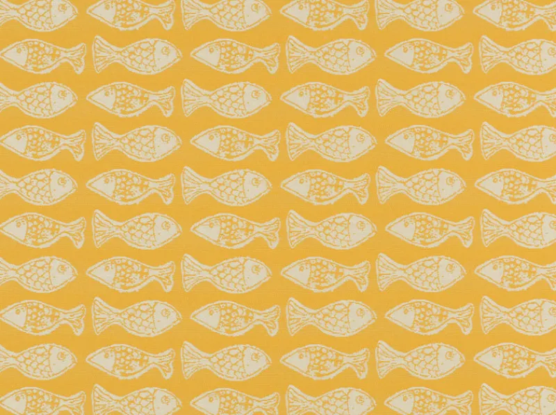 School Of Fish Sunshine is a bright golden yellow fish print outdoor fabric from Covington.