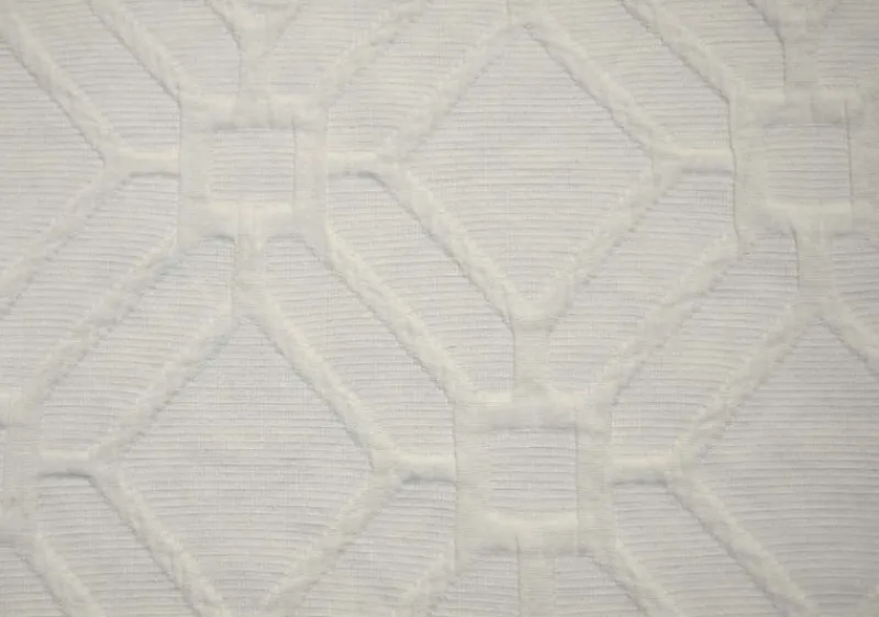 Meeko Satin is a pretty white matelasse trellis fabric from Edgar in stock and available at The Fabric Co. Meeko Satin would make a beautiful simple textured addition to any decorating project in your home.