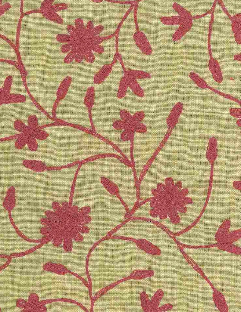 Pink Green Embroidered Floral Duchess Vine Rose on Celery Laura Kiran Fabric