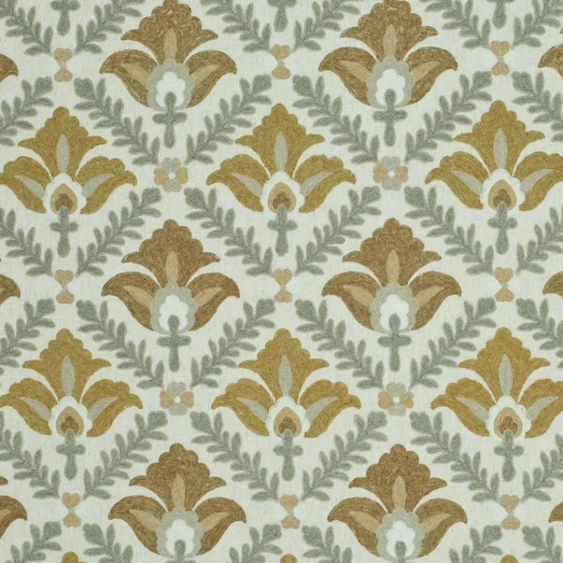 Add a pop of personality to your space with the Angeline Topaz fabric from P/Kaufmann. Featuring a vibrant floral pattern, this embroidered crewel fabric is adorned with hints of gold, green, and yellow, adding a touch of quirky elegance to any room (and making your friends green with envy). Perfect for DIY crafts or reupholstering furniture!