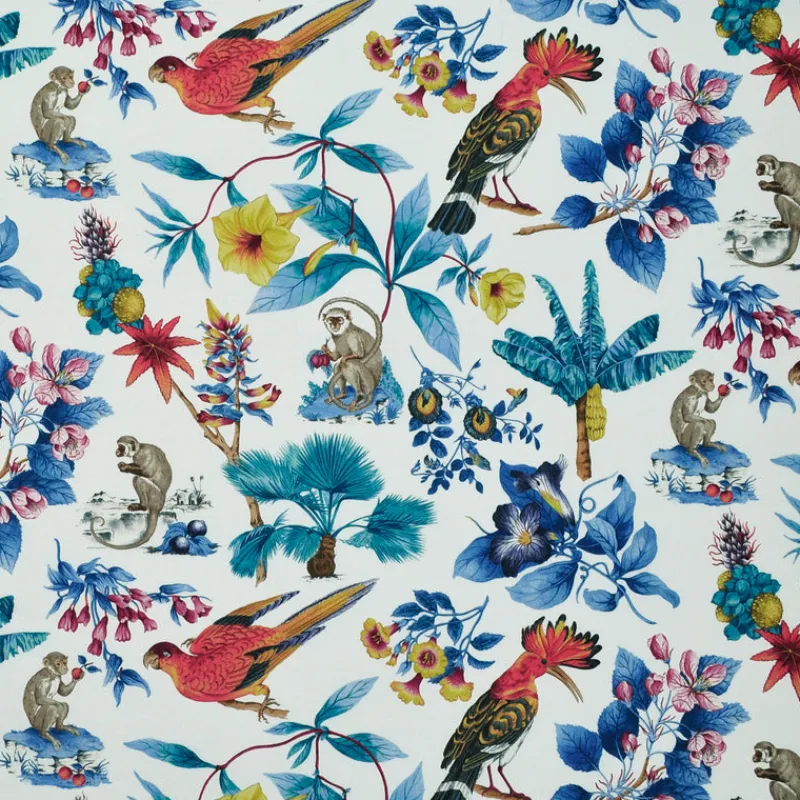 Get ready to add a touch of exotic flair to your home decor with the Bel Amour French Blue P/Kaufmann Fabric! This vibrant print features a tropical paradise full of colorful birds and playful monkeys, perfect for adding a playful touch to any room. Bring a touch of fun to your space with this unique and quirky fabric.