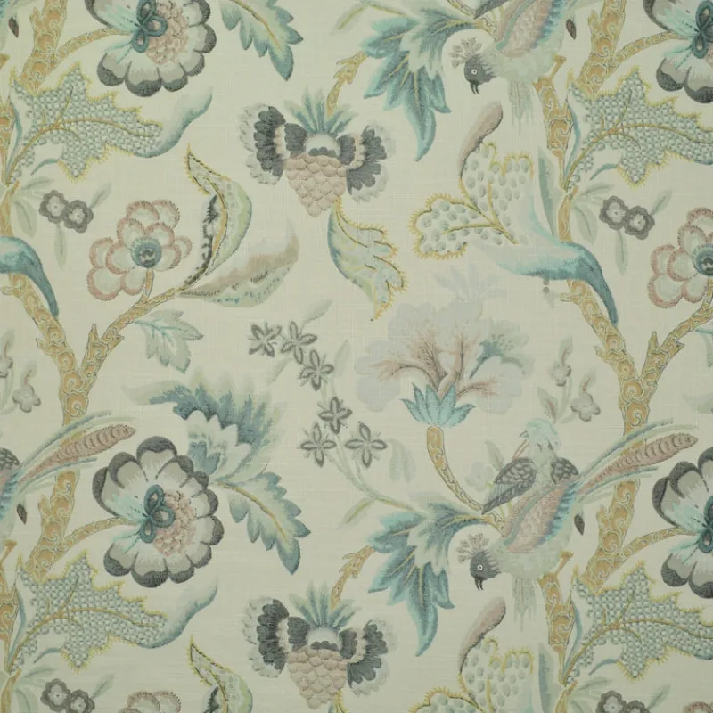 Introducing the Elizabetta Mist P/Kaufmann fabric, featuring a luxurious floral print with a sophisticated Jacobean pattern and bold, large flowers. Elevate your home decor with this exclusive and elegant fabric, perfect for adding a touch of refinement to any room.