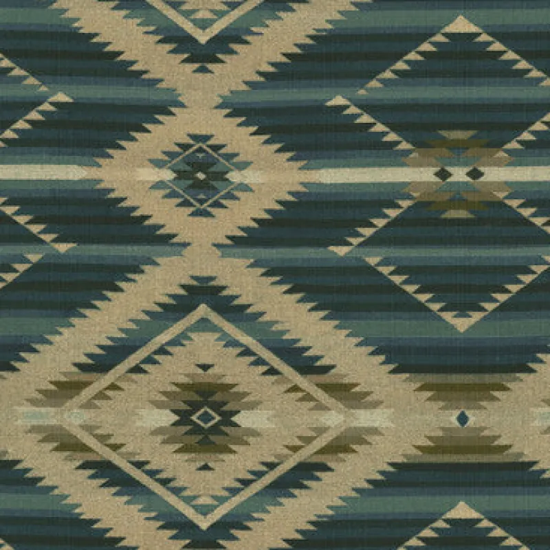 Elevate your interior design with our stunning Southwestern Upholstery Fabric, aptly named Blanket Statement Denim. This fabric features an intricate geometric pattern that draws inspiration from traditional Native American designs, adding a rustic charm to any space. The earthy tones of green, beige, and hints of terracotta create a warm and inviting atmosphere, making it a perfect choice for upholstery projects, drapery, pillows, and more.