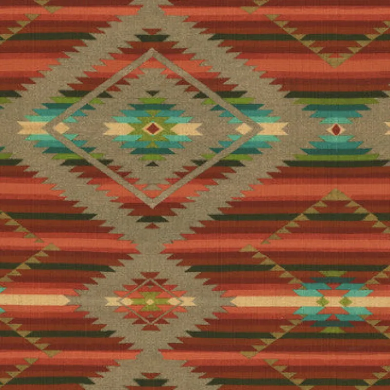 Elevate your interior design with our stunning Southwestern Upholstery Fabric, aptly named Blanket Statement Tamale. This fabric features an intricate geometric pattern that draws inspiration from traditional Native American designs, adding a rustic charm to any space. The earthy tones of green, beige, and hints of terracotta create a warm and inviting atmosphere, making it a perfect choice for upholstery projects, drapery, pillows, and more.
