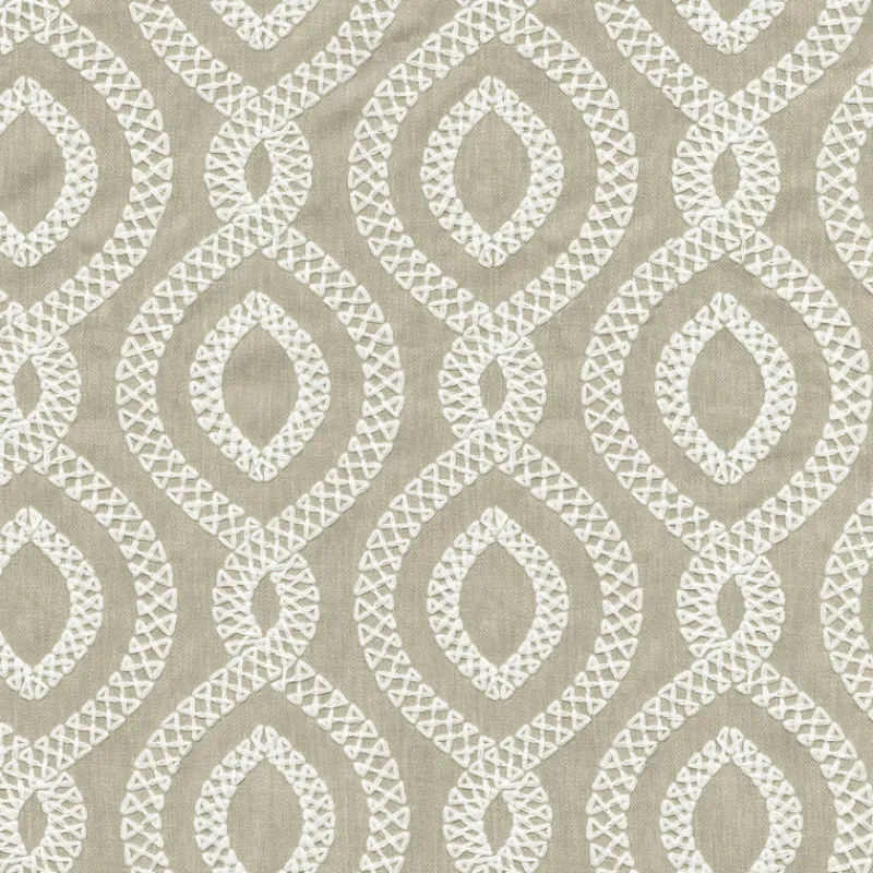 Elevate your space with our Pavilion EMB Linen fabric. Its refined taupe and white color scheme is elevated by an intricately embroidered geometric trellis pattern. Add a touch of luxury and sophistication to any room with this premium fabric.