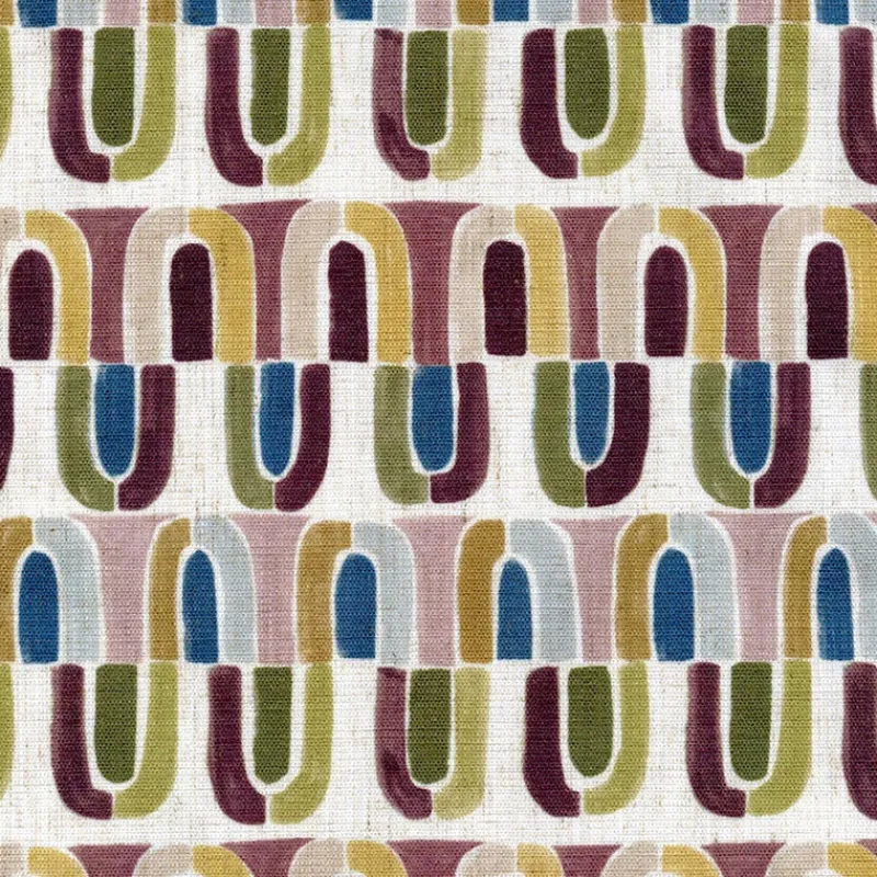 Experience the luxurious elegance of Eliza Berry Regal Fabric. This stunning fabric boasts a bold, half moon geometric print in vibrant, colorful hues that will bring a touch of vibrancy to any space. Elevate your home decor with the unique and eye-catching design of this geometric fabric.