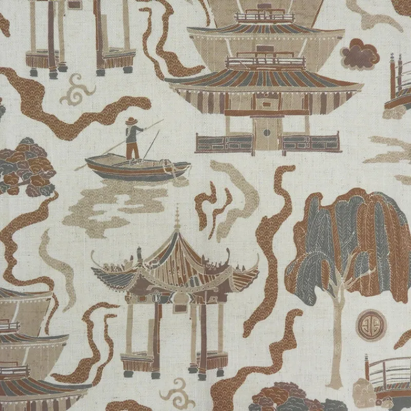 Kumano Flax Tan Asian Pagoda Toile Print Regal Fabric