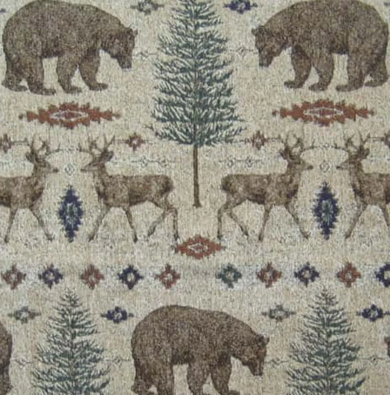 Ottawa Sand is a cool neutral creamy tan soft chenille upholstery fabric featuring bears, deer, and a classic nature scene from Regal.