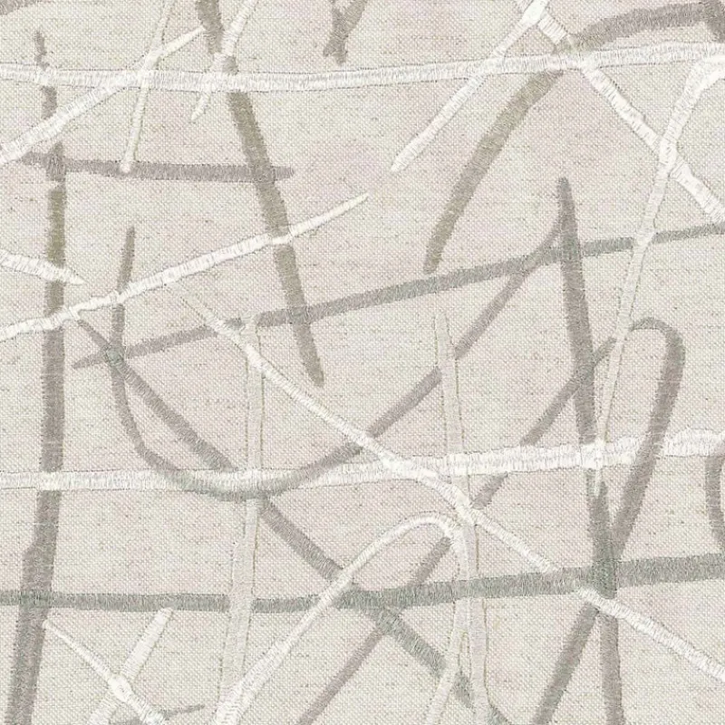 Scribble Platinum is a cool contemporary silvery grey and cream colored fabric featuring embroidered scrolling lines and stria from Regal.