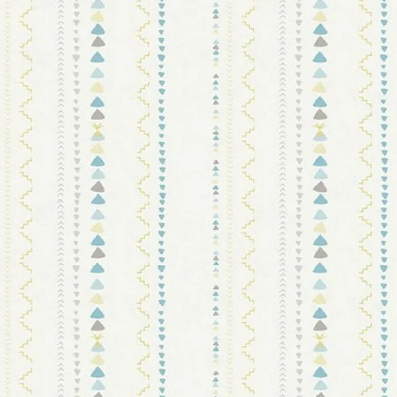 Cool light blue, yellow, and taupey grey triangles and geometrics make up this fun contemporary striped wallpaper.