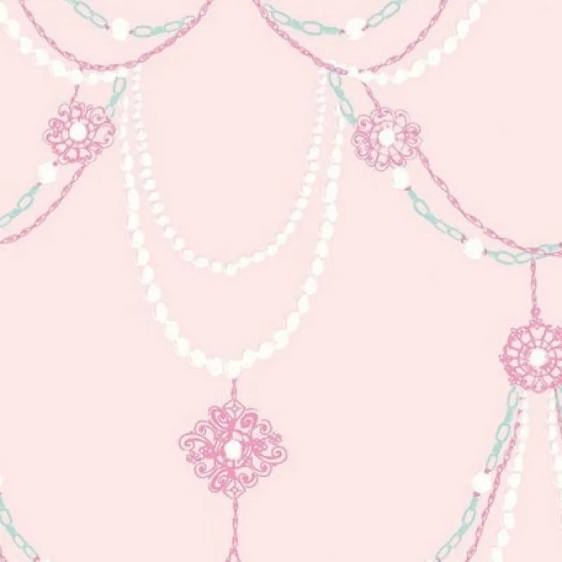 Pearls and necklaces chains drape across this fun pink wallpaper to create girly and glamourous wallpaper.