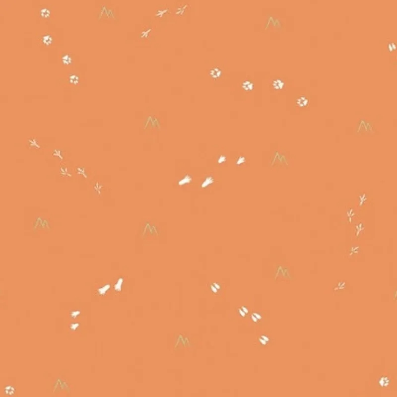 Little white animal tracks scroll up and across this fun bright orange wallpaper leaving much to the imagination.