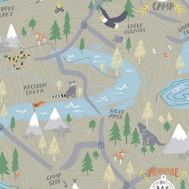 This neutral tan wallpaper features scenes from a campsite with trees, tents, and snakes.