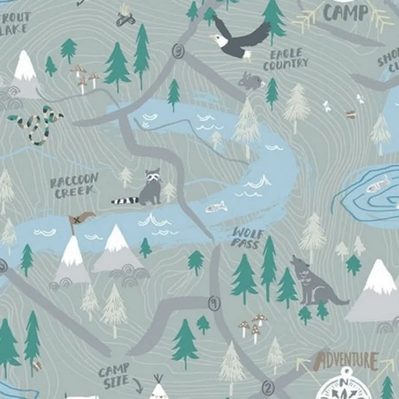 This neutral grey wallpaper features scenes from a campsite with trees, tents, and snakes.