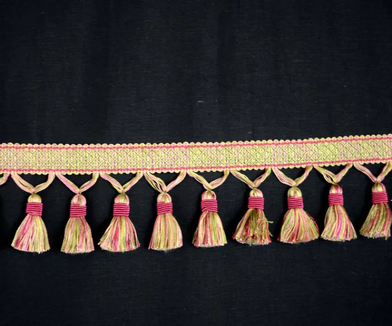 BF4005 Pink 42/14 Pink Green Tassel Trim Fringe. Gorgeous decorative tassel fringe trim for window treatments or throw pillows. 3.5″ long gorgeous tassel fringe with decorative banding.