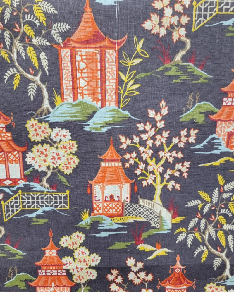 Shoji Lacquer Is an Asian Pagoda print Fabric. This particular fabric is a heavy-duty print at 27,000 double rubs, which makes it perfect for upholstery! If you are looking to bring just the right amount of color into your décor this is the perfect choice.