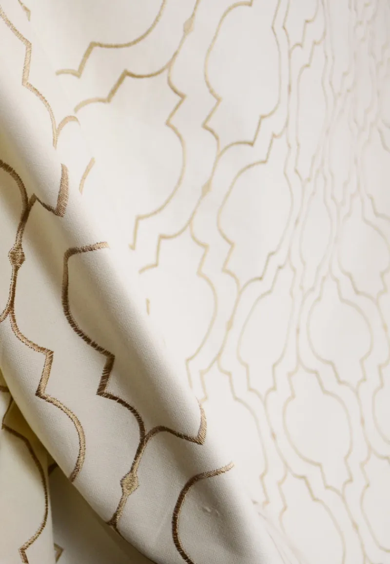 Gold embroidered geometric upholstery fabric on a sturdy white background. Beautiful design, perfect for covering a chair, toss pillows or make window valances. Helmsley Glow is 100% cotton, a nice medium weight that can be used for upholster, slipcovers, bedding, pillows or window treatments