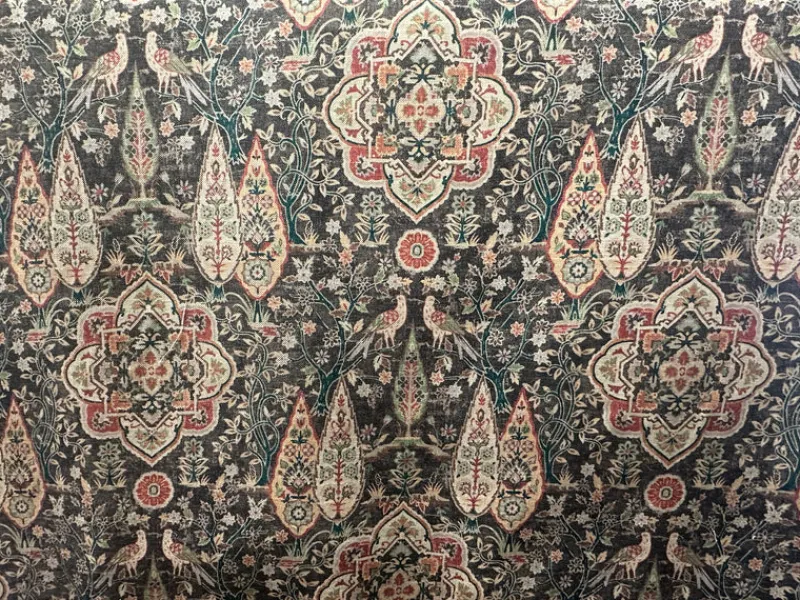Elevate your space with the timeless elegance of our Wanderer Nutmeg Upholstery Fabric. This exquisite fabric boasts a luxurious tapestry of intricate floral and paisley motifs, skillfully woven into a black backdrop. The design captures the essence of classic beauty, enriched with vibrant hues of red, gold, green, and tan that bring an opulent charm to any setting.