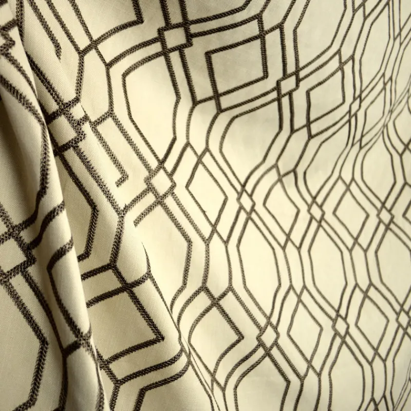 Walnut brown and black cross stitch-like embroidery creates the geometric trellis pattern on a beige fabric to make up Harris Natural. This 52% Polyester | 48% Cotton fabric would be beautiful made in pillows, window treatments, bedding and more.