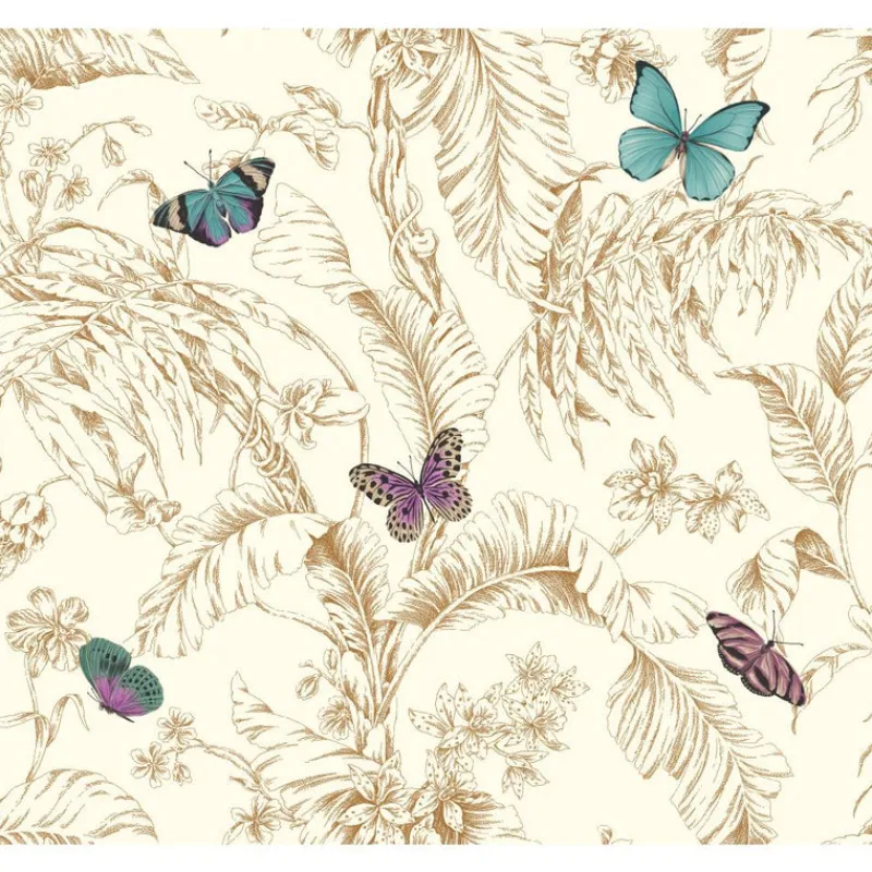 Shimmery bronzey gold tropical toile is made modern with the addition of floating bright colorful blue butterflies in this wallpaper from Ashford House by York.