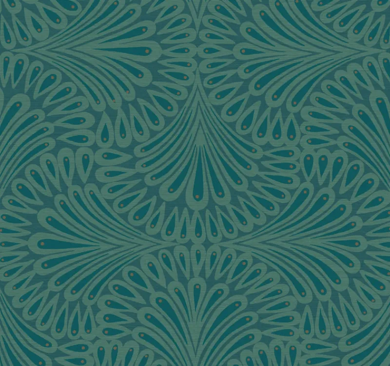 A graceful curvilinear design, Cabaret Wallpaper is punctuated with metallic dots and features stylized peacock feather fans reminiscent of a 1920s dancer’s costume.
